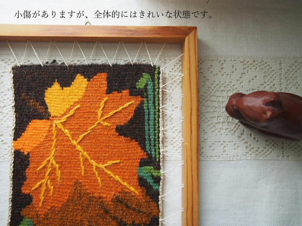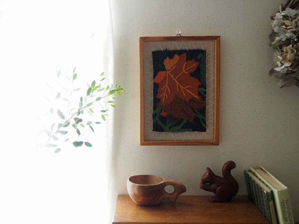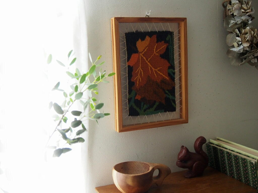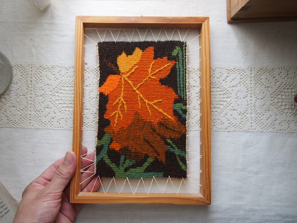 北欧ヴィンテージ雑貨 もみじ柄のフレミッシュ織りスウェーデンの木枠タペストリー