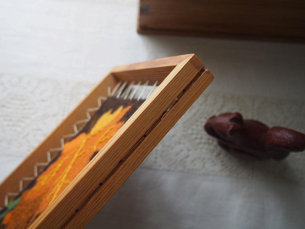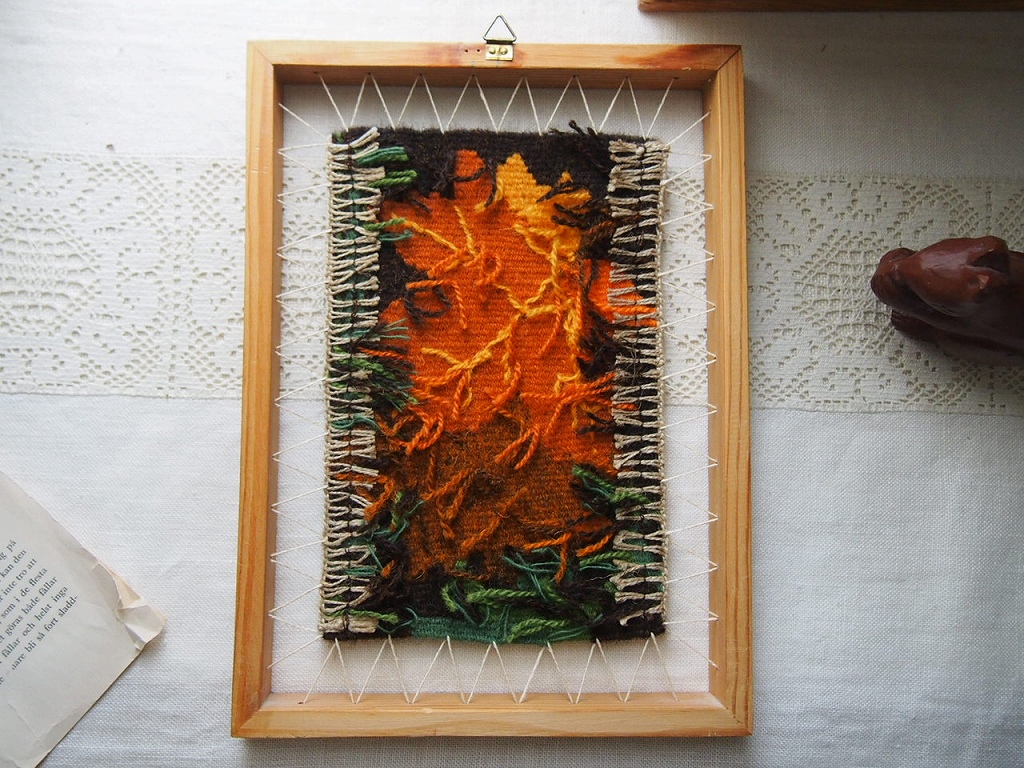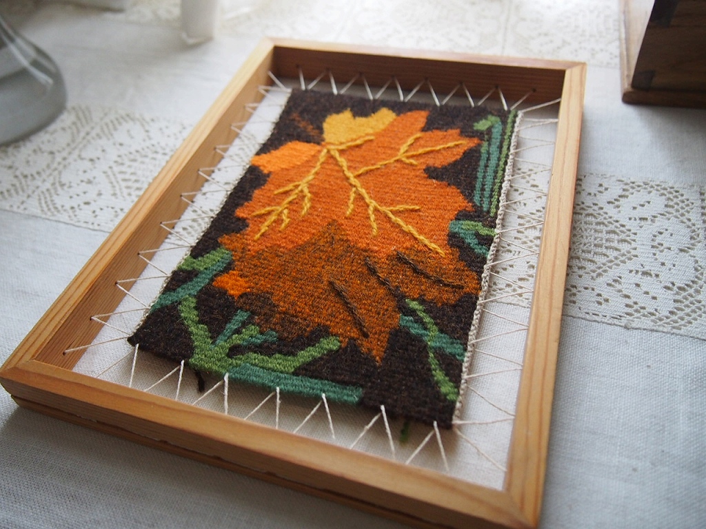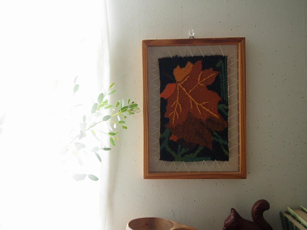 北欧ヴィンテージ雑貨 もみじ柄のフレミッシュ織りスウェーデンの木枠タペストリー