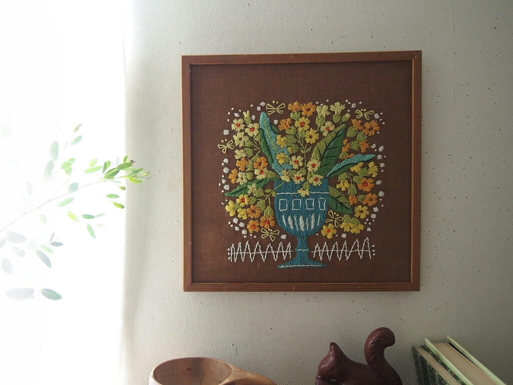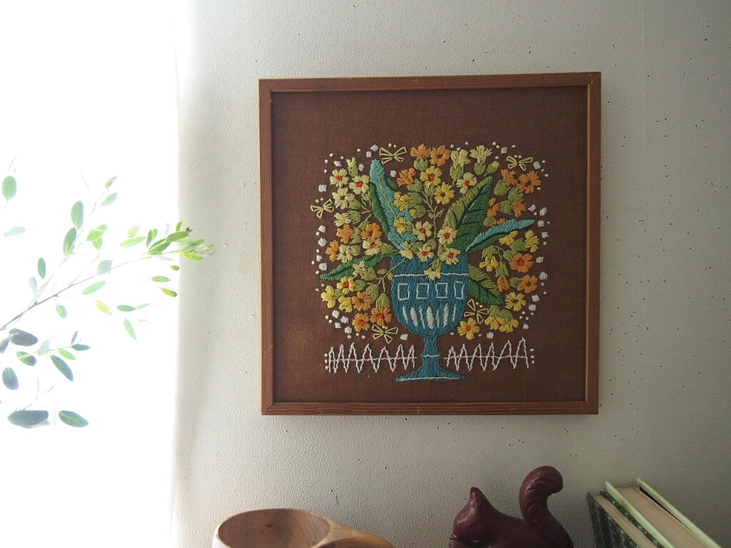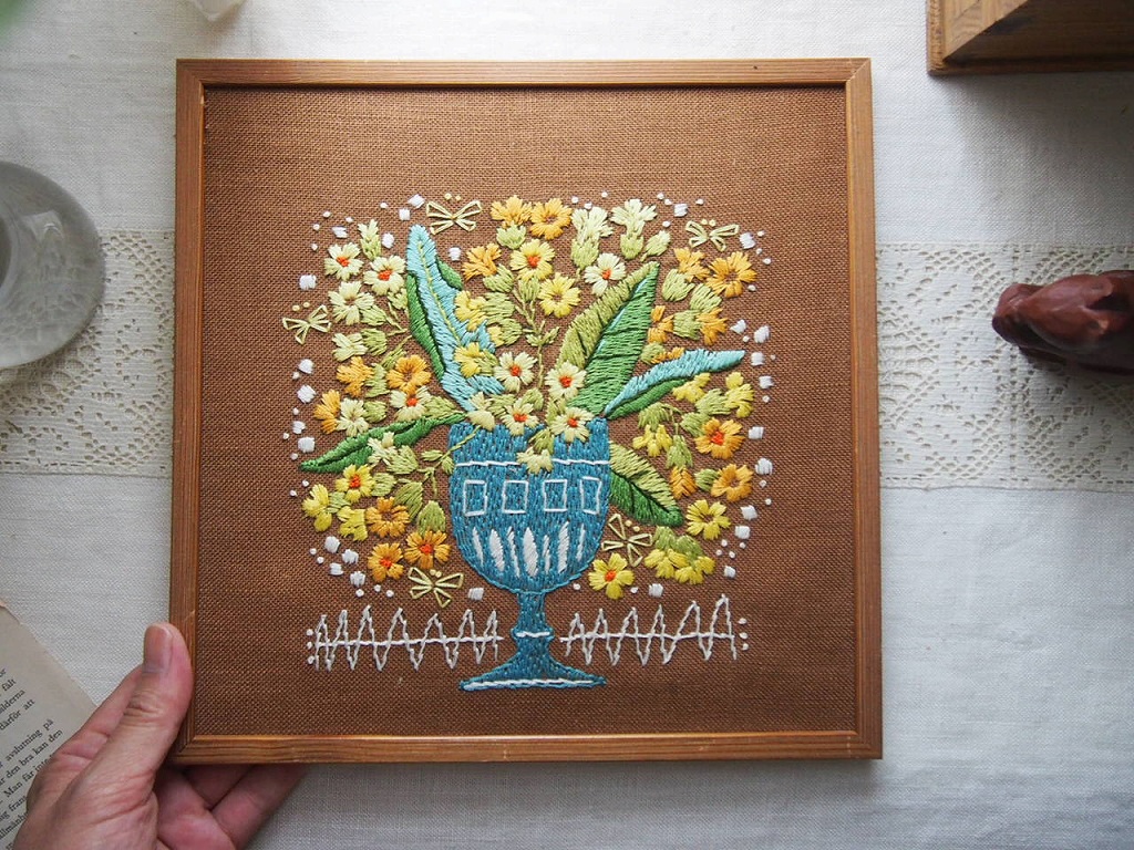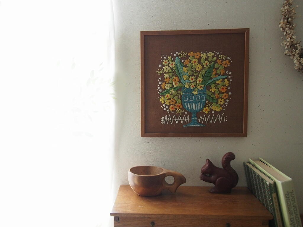 北欧ヴィンテージ雑貨 スウェーデン 刺しゅうタペストリー 木製フレーム お花と花瓶