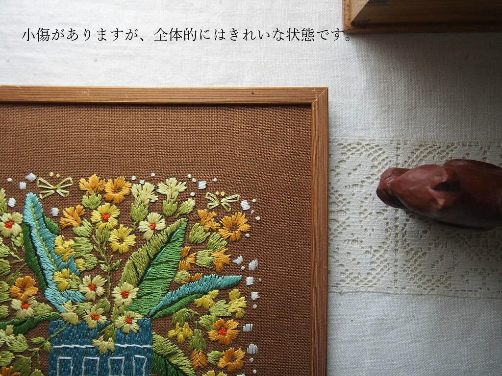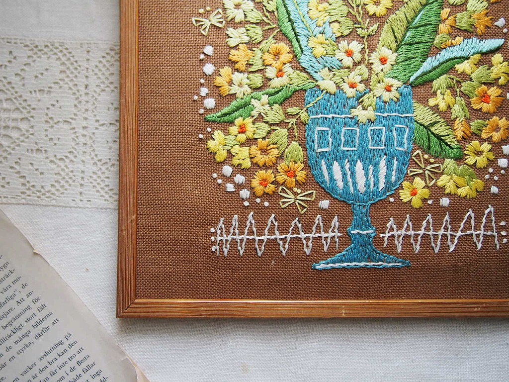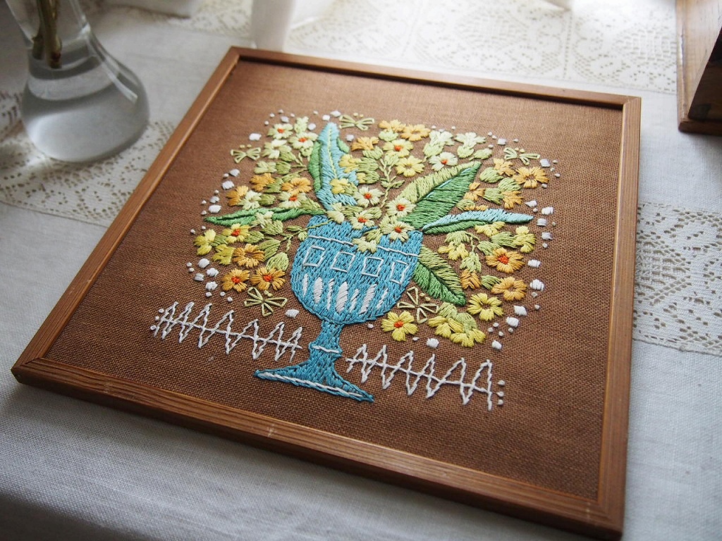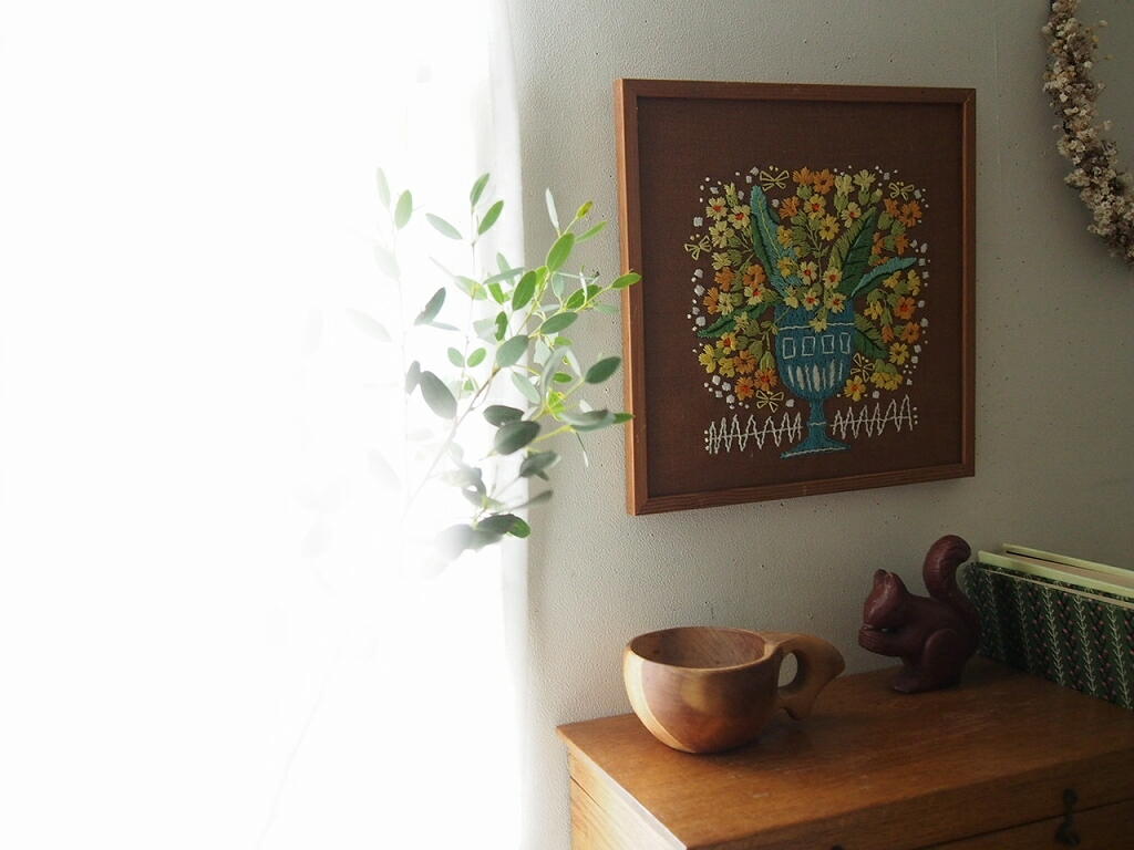 北欧ヴィンテージ雑貨 スウェーデン 刺しゅうタペストリー 木製フレーム お花と花瓶