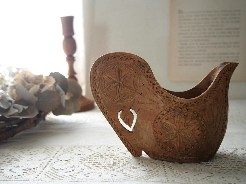 木製コーサ/雪の結晶モチーフの手彫り装飾/北欧ヴィンテージ・ハンドクラフトの木の器