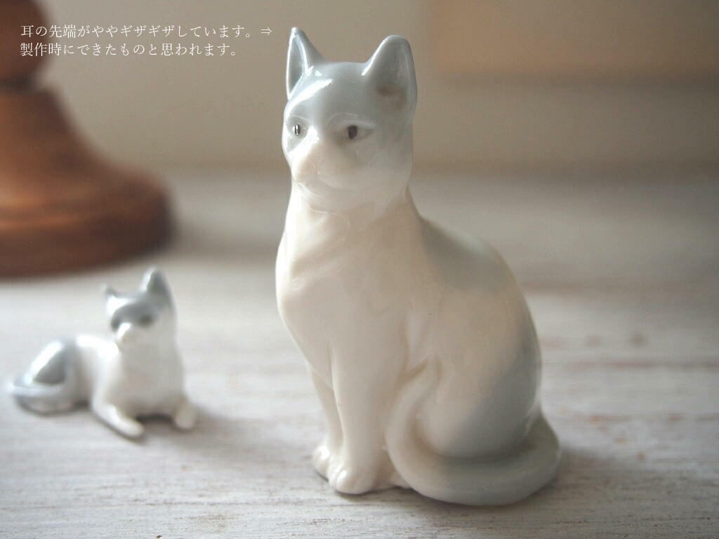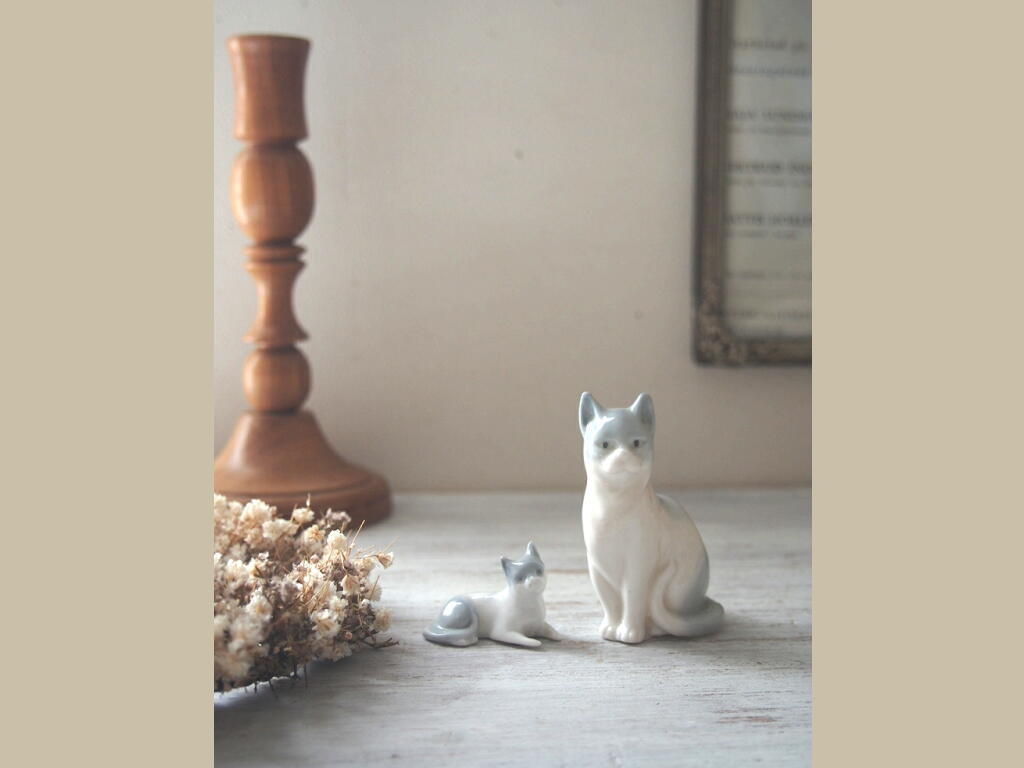 猫の親子の磁器フィギュリン/ドイツ製ヴィンテージ/グレー&ホワイト/1950–60年代/小さな置物 [TVM251-12602]