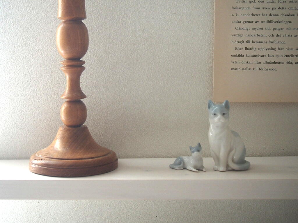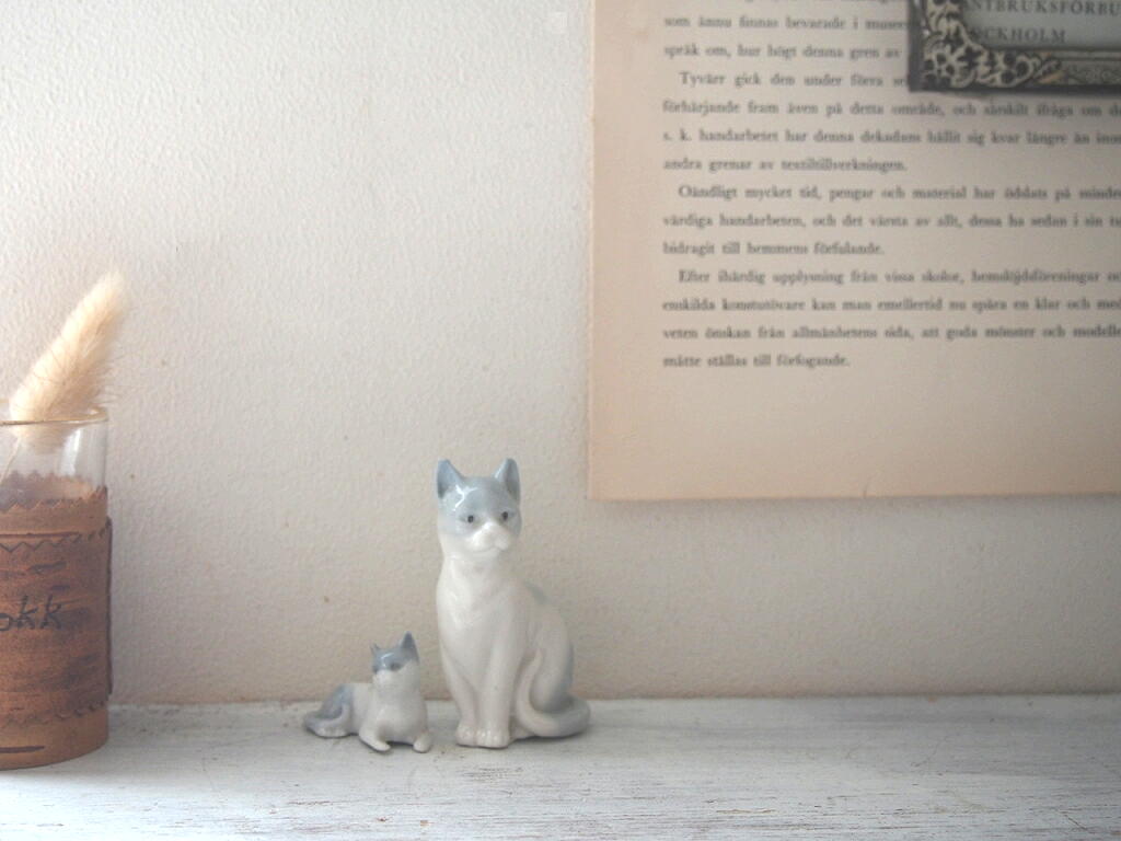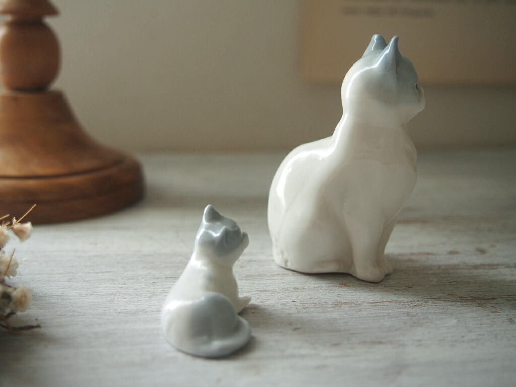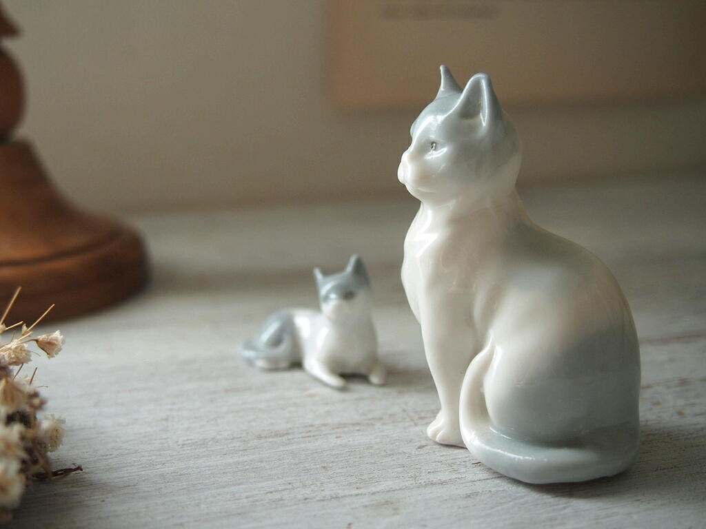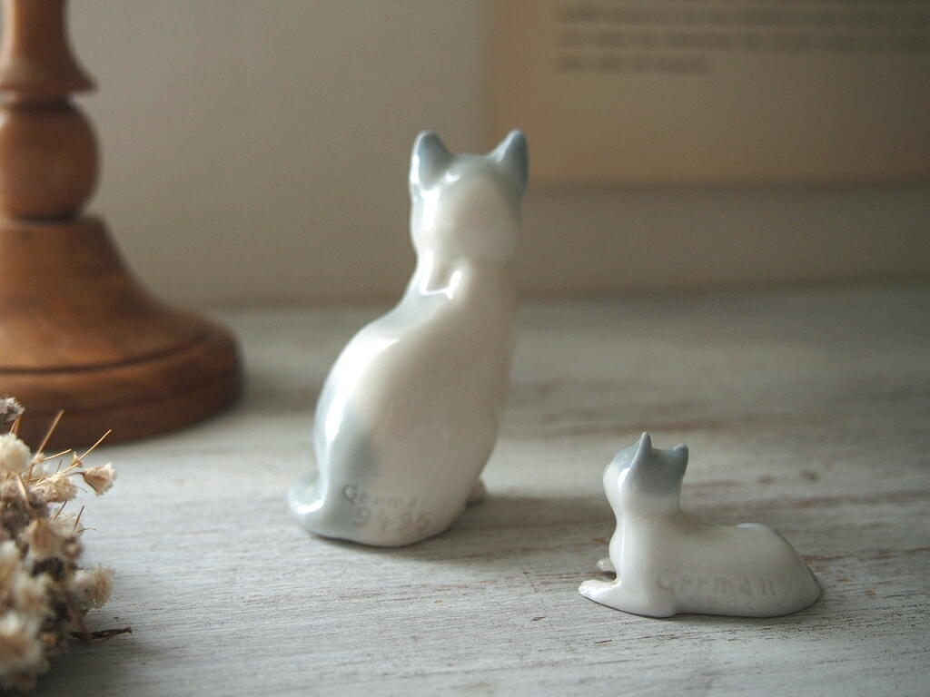 猫の親子の磁器フィギュリン/ドイツ製ヴィンテージ/グレー&ホワイト/1950–60年代/小さな置物