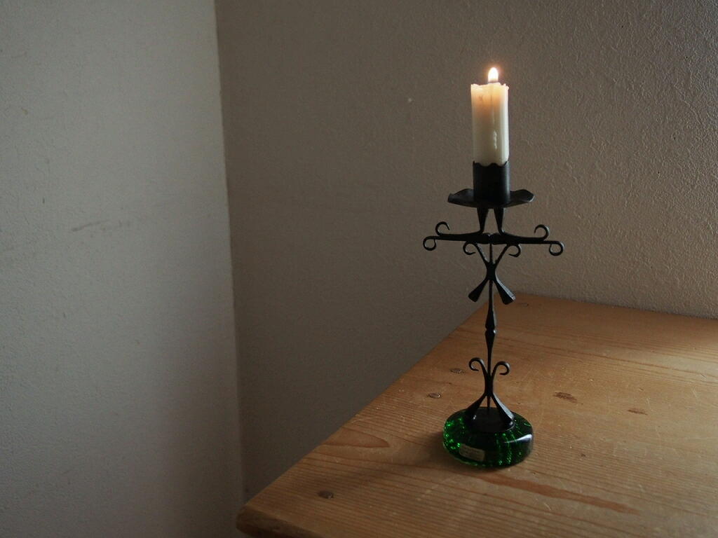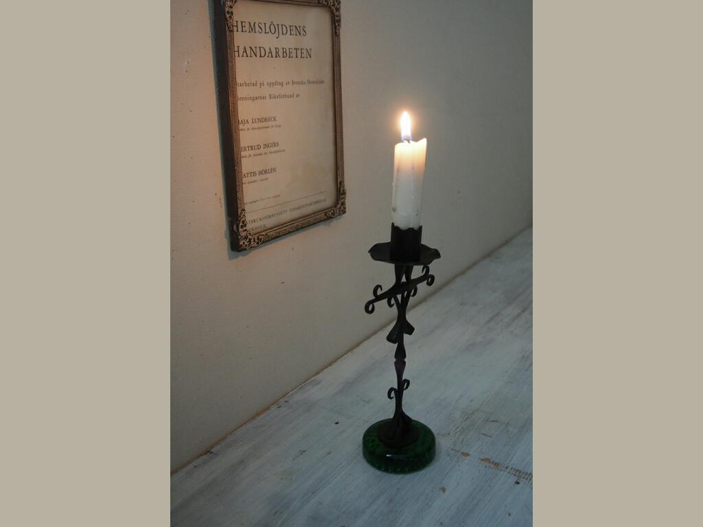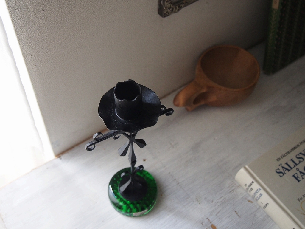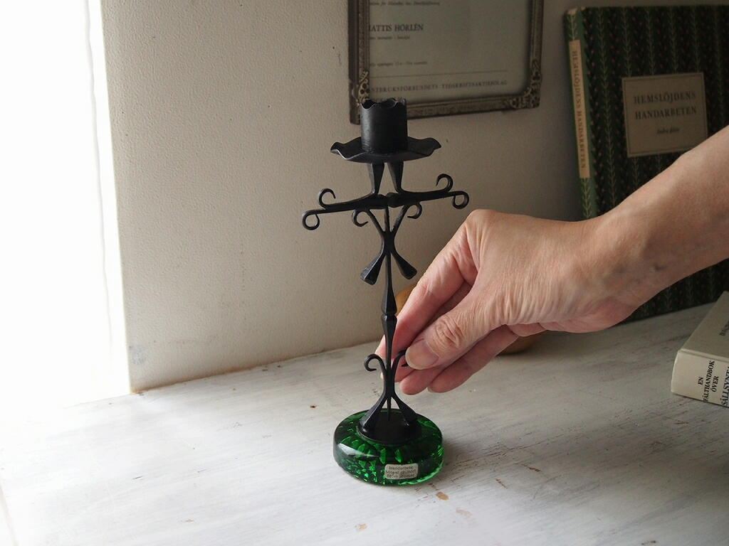 スウェーデン製 ガラス×鉄製キャンドルホルダー/緑ガラスのベース付き/1970年代の北欧キャンドルスタンド/北欧ヴィンテージ(スウェーデンヴィンテージ)